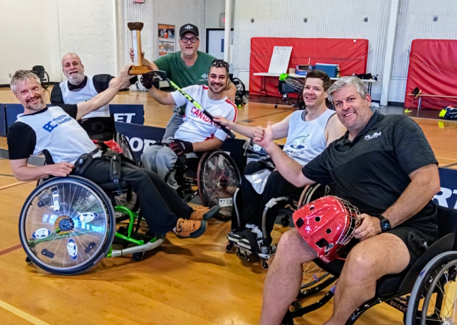 Another Canadian Wheelchair Floorball Hockeyball National tournament is now in the books where a changing of the guard took place. Team Canada White ended up winning the championship “Cherry Bowl” by a final score of 8 – 7 over the defending champions, team Canada Black. Canada Black was up by a score of 7 – 6 with a little over 2 minutes remaining, when team Captain Jaimie Borisoff scored the game tying and game winning goal with what seemed like one hand tied behind his back, which is extra hard when pushing a wheelchair against a defending championship winning team. Jaimie Evansdad Borisoff took home 1st Star with 3 goals and 1 assist in the final, Beaudy Beaudin took home 2nd Star with 5 goals in his wheelchair debut, and Quin Gieni walked away with 3rd Star with 1 goal and 4 delicious, however bittersweet, red apples in the final game.